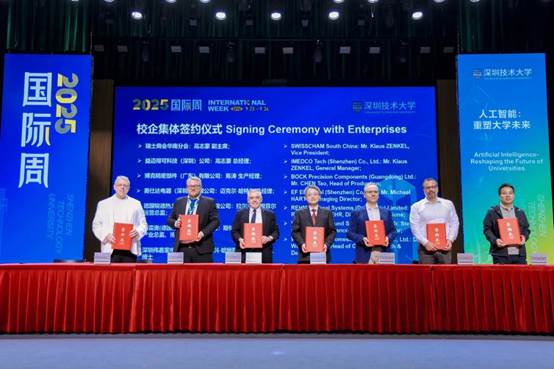 校企签约仪式上,深圳技术大学副校长梁永生教授与瑞士商会华南分会副主席、益迈得可科技(深圳)公司总经理高志豪,博克精密部件(广东)有限公司生产经理陈涛,奥仕达电器(深圳)有限公司总经理迈克尔・哈特尔,德国锐德热力设备(东莞)有限公司运营总监拉尔夫・瓦根菲尔,法雷奥 (德国) 开关及传感器公司高级产业总监斯特芬・克拉尔曼,深圳伟嘉家电有限公司全球研发经理维尔科・哈姆斯代表校企双方签约。