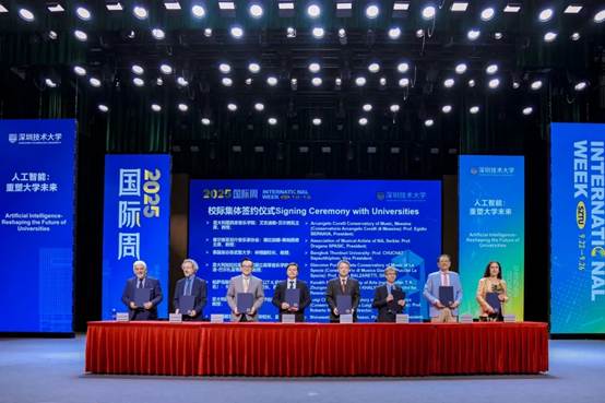 校际签约仪式上,深圳技术大学副校长梁永生教授与意大利墨西拿音乐学院主席艾吉迪奥・贝尔纳瓦教授,塞尔维亚尼什音乐家协会主席德拉加娜・斯帕西奇教授,泰国曼谷吞武里大学副校长林栩教授,意大利加拉拉泰普契尼国立高等音乐学院院长卡洛・巴尔扎雷蒂教授,哈萨克斯坦国立艺术学院副校长卡比勒・哈里科夫教授,意大利佛罗伦萨音乐学院副院长罗伯托・内里教授,泰国西那瓦国际大学校长周非副教授代表校际双方签约。